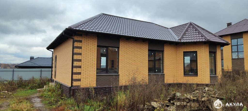 Надежное строительство: Дом возведен из газосиликатных блоков, что гарантирует отличную теплоизоляцию и долговечность. Фасад облицован стильным песочным кирпичом с эффектными вставками из темного кирпича, придающими дому индивидуальность.