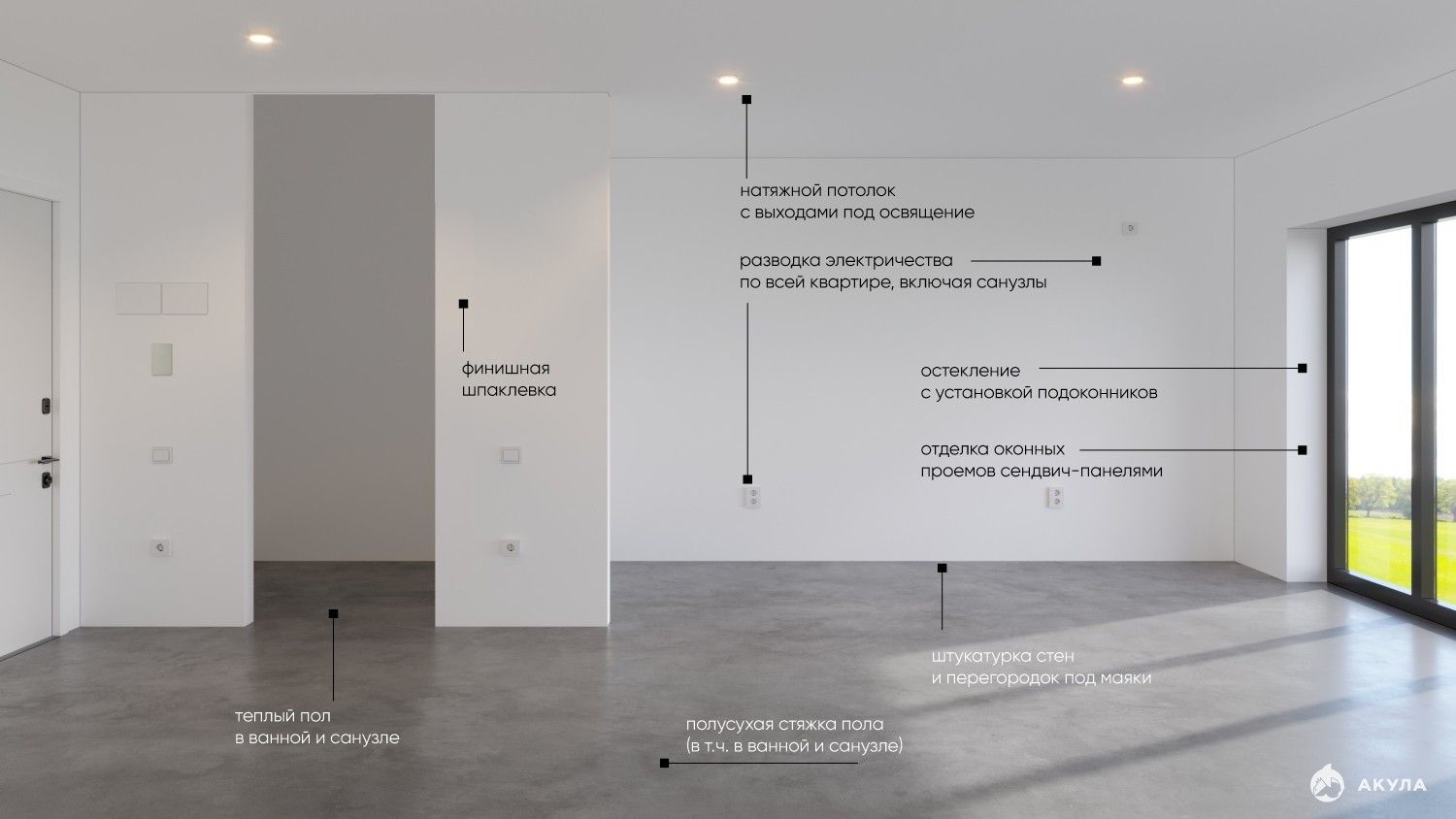 - полусухая стяжка пола (в т.ч. в ванной и санузле)