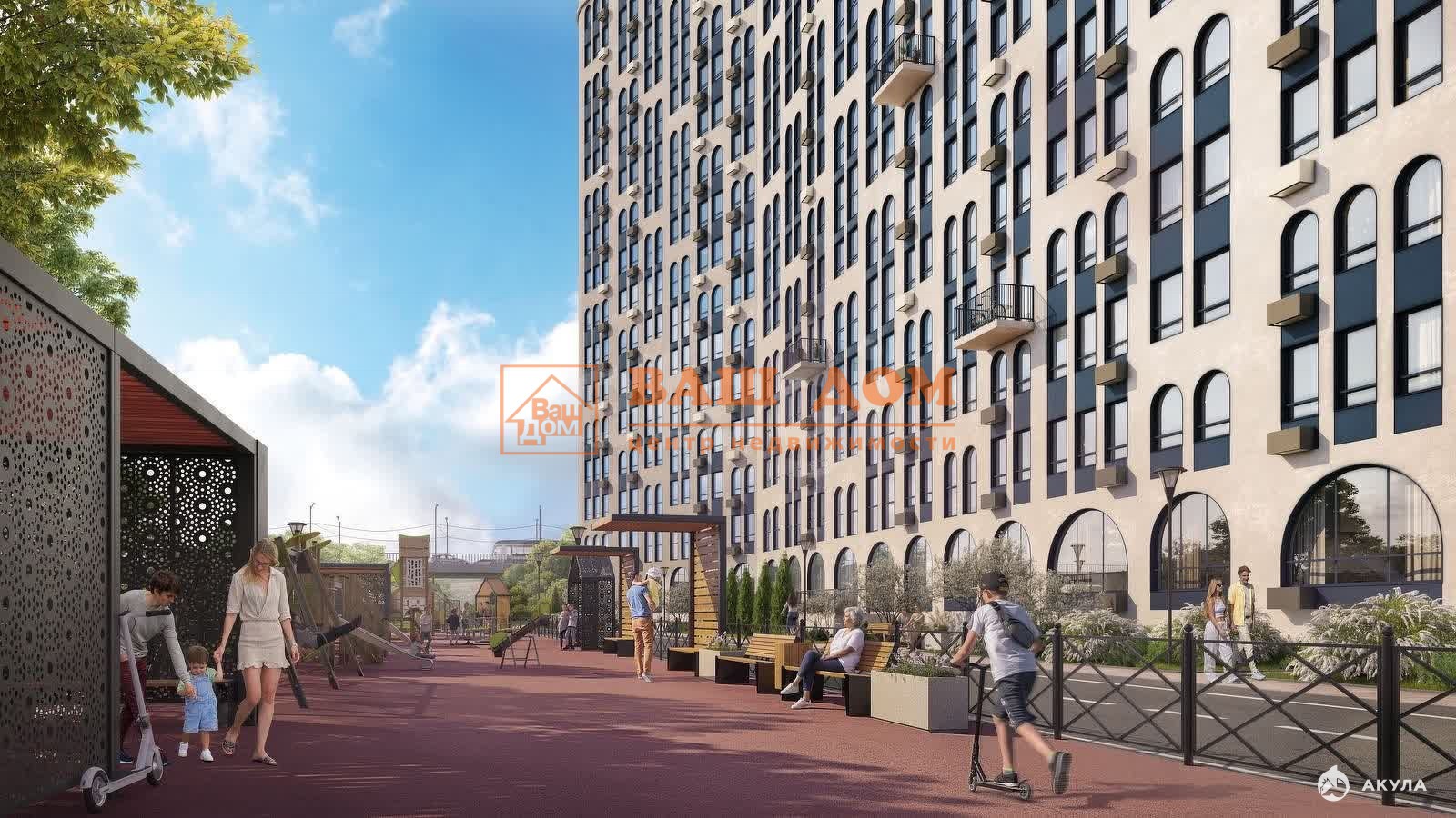 Арочная форма окон добавляет шарма визуальному образу и ярко выделяет комплекс, задавая тренды развития всего района.