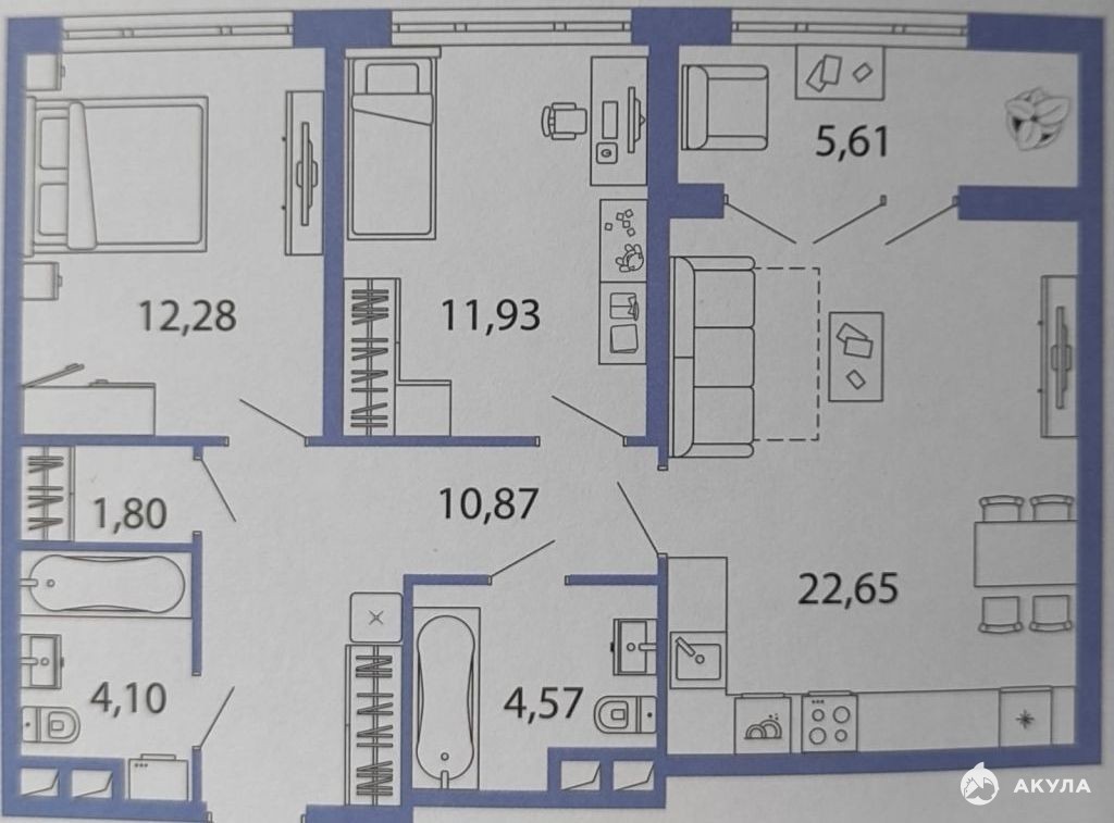 Две изолированные комнаты, просторная кухня-гостинная с лоджией, 2 санузла, гардеробная, просторный коридор (планировка есть в объявлении, можете ознакомиться).