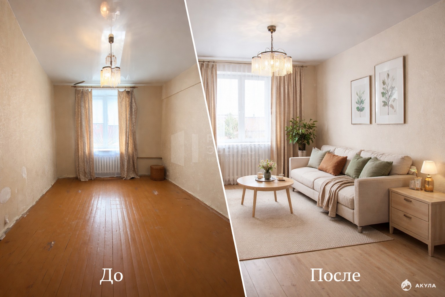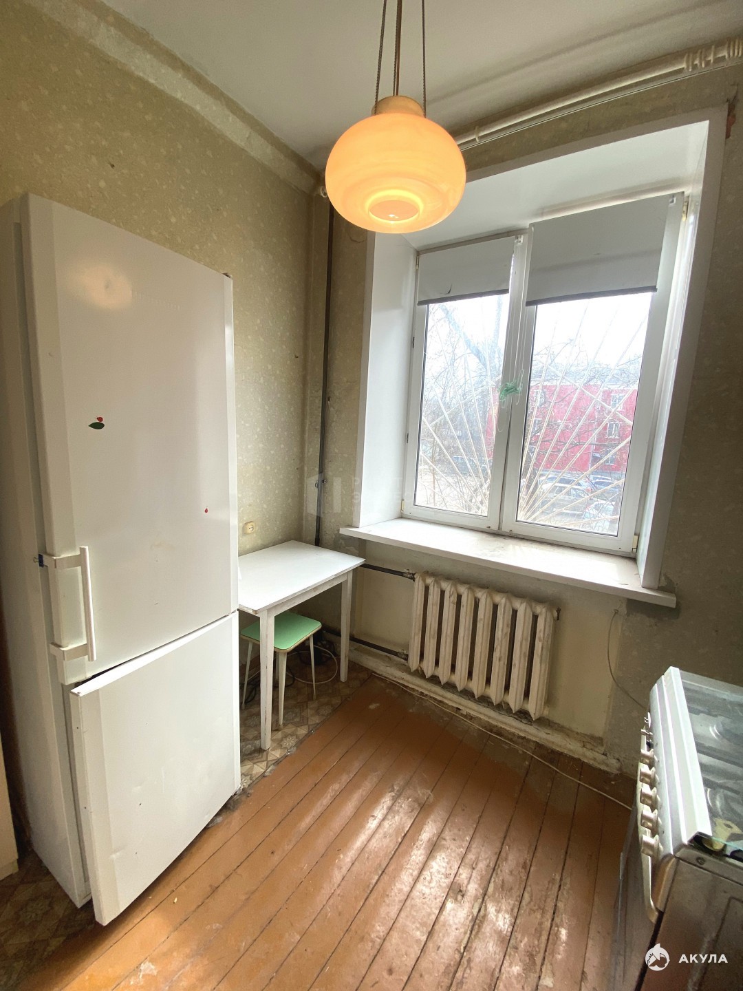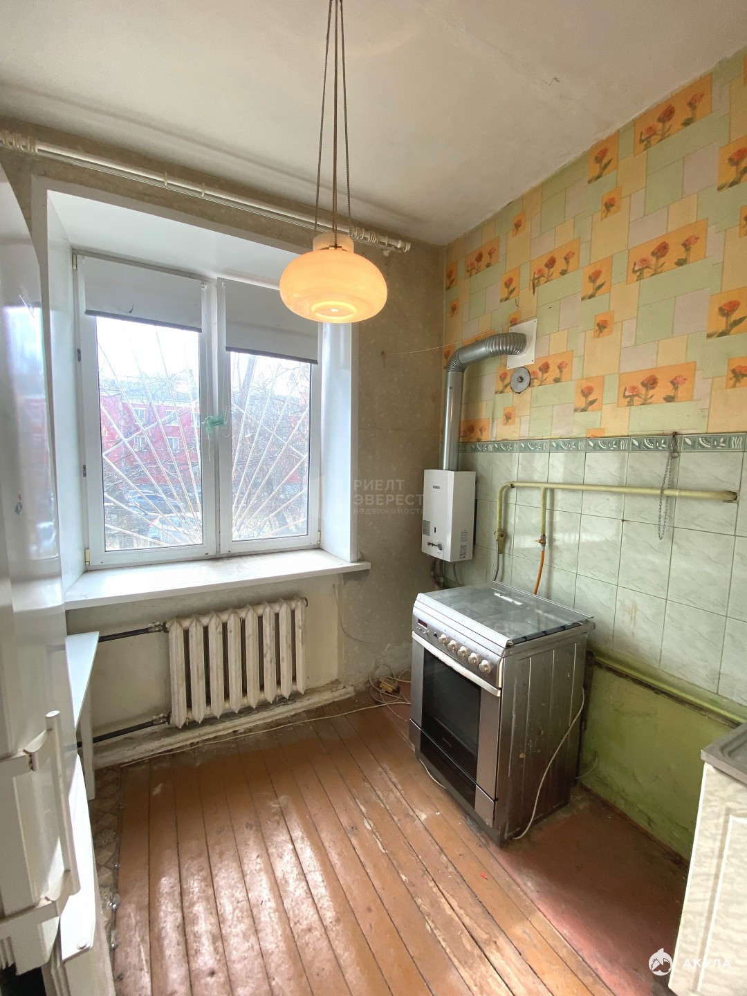 На кухне газовая колонка полуавтомат, газовая плита, в квартире счётчик электрический и счётчик на воду.Одна из фотографий — это ИИ-визуализации. Она показывает вариант отделки комнаты.