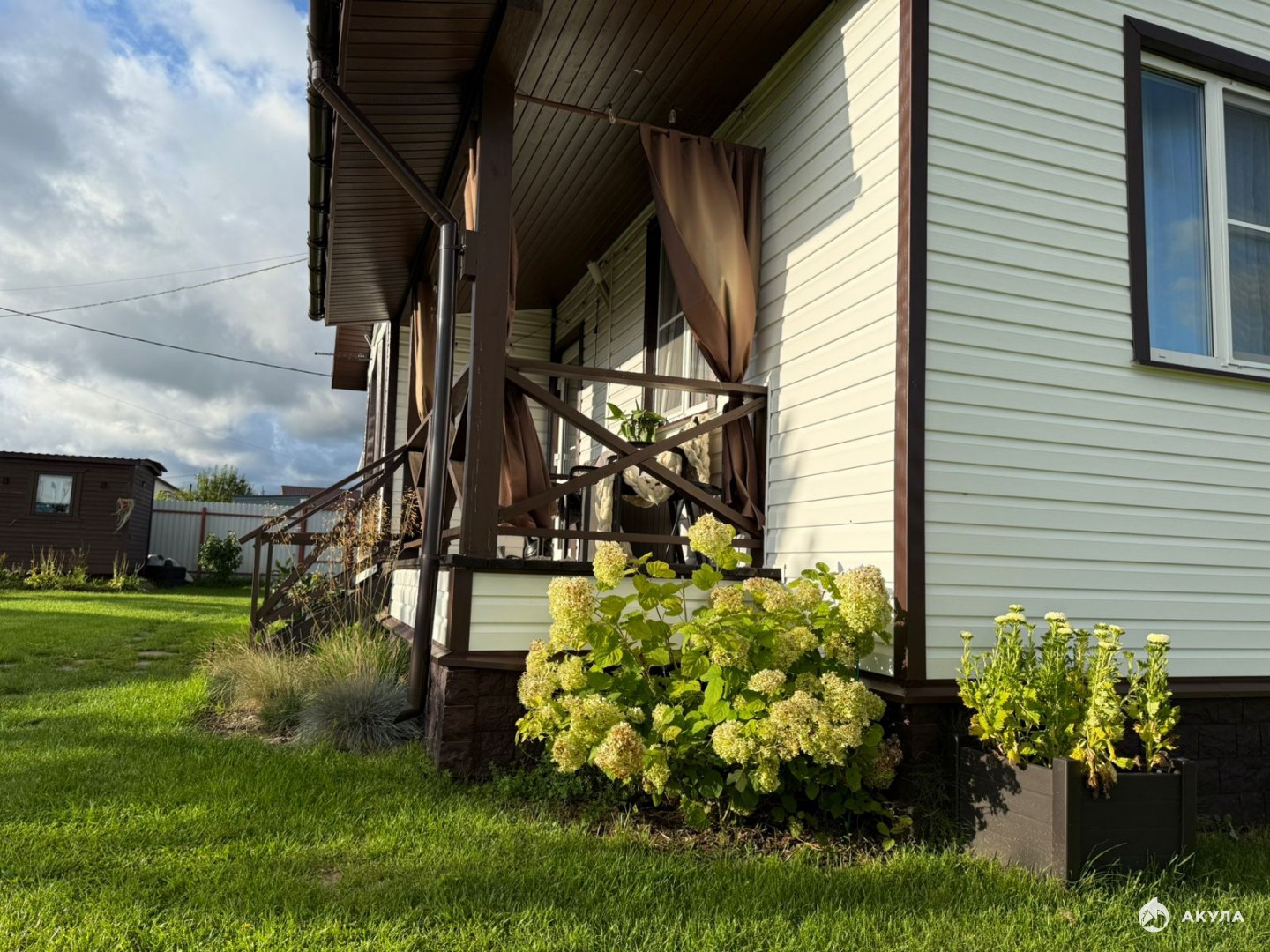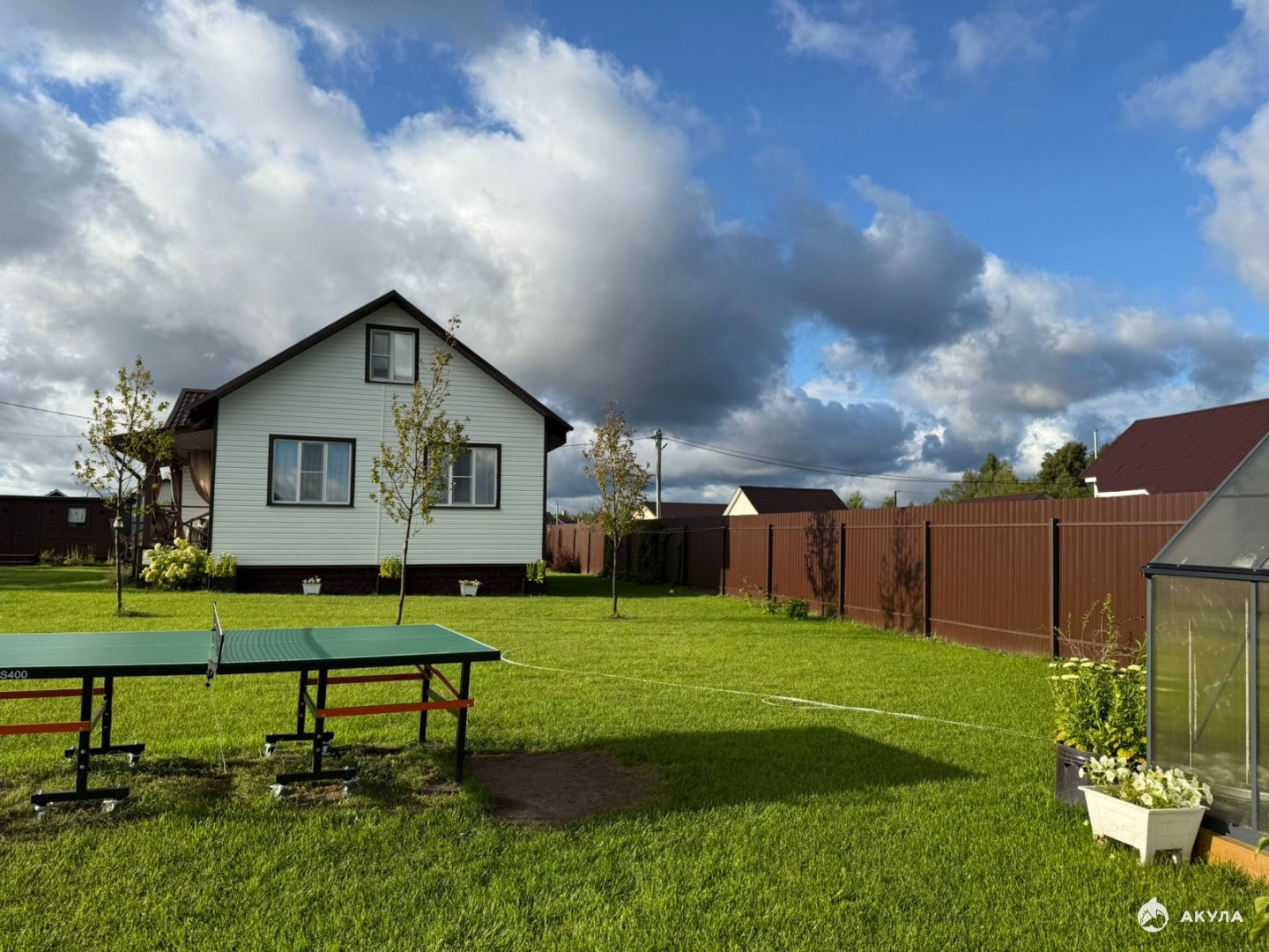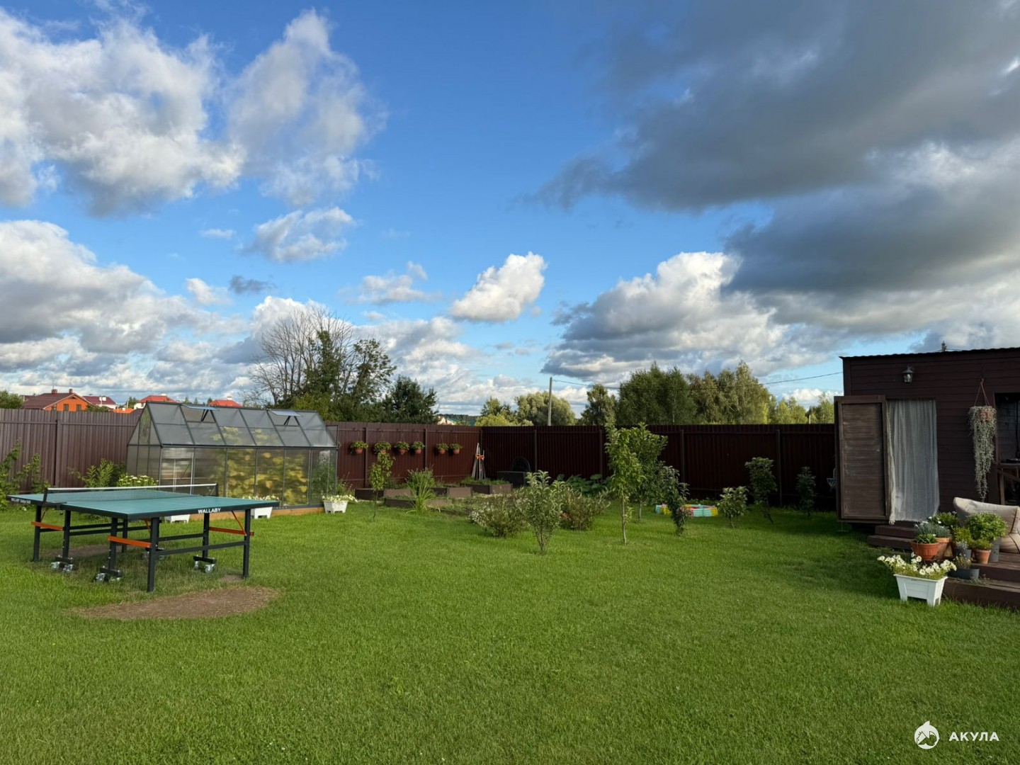 Участок 15 соток (ЛПХ), выровнен и засеян газонной травой. По периметру огорожен забором из профлиста. Заезд под 2 авто. Вывод воды для полива сзади дома. Огромное разнообразие плодово-ягодных и декоративных культур. Зона огорода, высокие грядки, ящик для компоста, теплица. Беседка с мастерской (проведено электричество). Садовая мебель в беседке и Мастерской остается, уличные шторы тоже. Зона барбекю остается полностью (мангал, стол, печь, лавочки, садовые пластиковые сундуки). Футбольные ворота, держатель для гамака, садовые качели, батут, песочница, детский игровой дом пластиковый с горкой, зона очага с шезлонгами - все остается. Утепленный хозблок с дровником (так же проведено электричество). Стеллаж для хранения резины, стеллажи деревянные, рабочий стол металлический остаются.